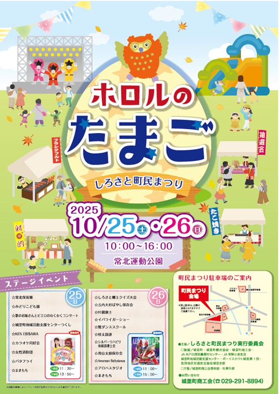 今年の「ホロルのたまご~しろさと町民まつり~」は令和7年10月25日(土)・26日(日)の2日間に開催いたします。出店を希望する方は申込書に必要事項を記入の上、城里町商工会までお申し込み下さい。 ◯日 時 令和7年1 […]