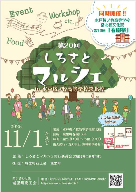第20回しろさとマルシェin水戸桜ノ牧高等学校常北校を開催いたします。 日 時:令和7年11月1日(土) 9:00~14:00 会 場:水戸桜ノ牧高等学校常北校(城里町春園1634) ※いつもと会場が違いますのでご注 […]