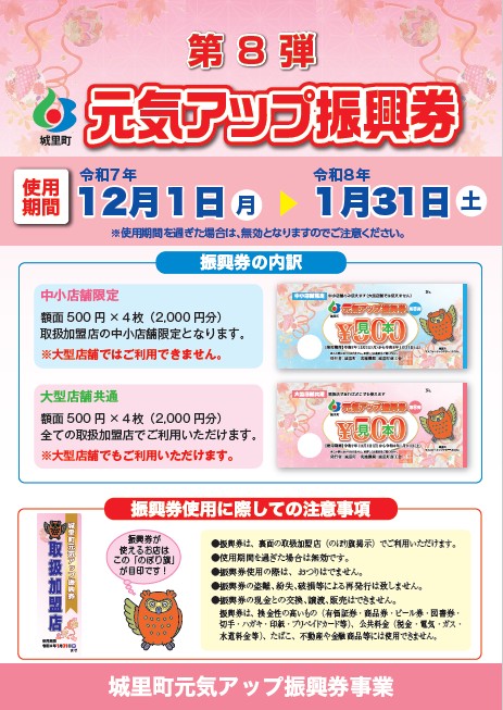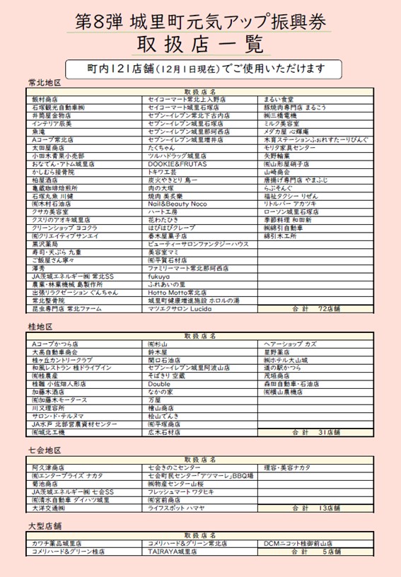 【第8弾】城里町元気アップ振興券取扱店一覧 2025 11/04 2025年11月4日 第8弾の元気アップ振興券の使用期間は、令和7年12月1日(月)~令和8年1月31日(土)までとなります。使用期間を過ぎると使用できなくなります。お早めにご利用ください。第8弾の元気アップ振興券をご使用できる店舗は下記PDFファイルをご覧ください。 ★取扱加盟店に、井筒屋金物店(常北地区)が追加になりました。 【第8弾】城里町元気アップ振興券取扱店一覧 121店舗(PDF) 【第8弾】城里町元気アップ振興券取扱店一覧の情報 企業・店舗名 フリガナ 郵便番号 住所 電話番号 FAX番号 ホームページ 営業時間 定休日 第20回しろさとマルシェin水戸桜ノ牧高等学校常北校 開催のご案内 関連情報 第20回しろさとマルシェin水戸桜ノ牧高等学校常北校 開催のご案内 2025年10月7日 ホロルのたまご~しろさと町民まつり~開催のお知らせ 2025年10月7日 【第8弾】城里町元気アップ振興券取扱店募集のお知らせ 2025年9月4日 第20回しろさとマルシェ出店者募集のお知らせ 2025年8月27日 夏季休業のお知らせ 2025年8月6日 年収の壁対策セミナー開催のお知らせ 2025年7月30日 ホロルのたまご~しろさと町民まつり~出店者募集のお知らせ 2025年7月10日 しろさと七夕まつり2025開催のご案内 2025年7月10日 MENU HOME PHONE NEWS ACCESS 閉じる 目次 閉じる